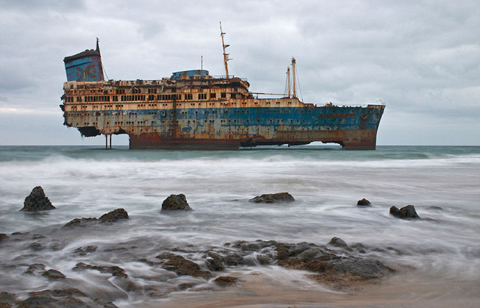 8.西班牙加那利群岛海域上停滞的美国废弃轮船。锈迹斑驳,依旧壮观。